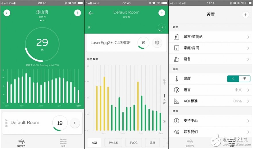 Kaiterra的主界面還算比較友好,簡(jiǎn)潔直觀,屏幕大部分區(qū)域顯示的當(dāng)?shù)爻鞘斜O(jiān)測(cè)站的綜合指數(shù)信息和每小時(shí)指數(shù)變化的柱狀圖表,而下方則是鐳豆2+實(shí)時(shí)檢測(cè)的綜合指數(shù)。進(jìn)入查看鐳豆2+實(shí)時(shí)檢測(cè)數(shù)據(jù)界面,可以更加直觀地了解到它的AQIPM2.5、TVOC、溫度和濕度的檢測(cè)數(shù)據(jù),用戶可以以分鐘、小時(shí)或者天為單位進(jìn)行查看。在設(shè)置選項(xiàng)里,還可以選擇中國(guó)或者美國(guó)的AQI標(biāo)準(zhǔn),兩者差距頗大,可以看出美國(guó)的AQI標(biāo)準(zhǔn)要求更為嚴(yán)格。