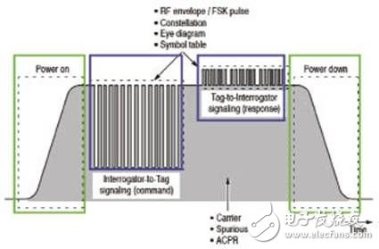 RFID一致性測試主要包括了載波測試,雜散,ACPR,時域功率和包絡,解調和解碼測試。圖5中RFID波形圖中標注了測試的位置和項目,灰色部分代表了載波測量項目,綠色代表了功率開關時間參數,藍色代表了包絡和解調部分。