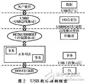 如圖2所示,USB HOST的軟件結(jié)構(gòu)分為3大部分,即USB總線驅(qū)動(dòng)(USBD),USB HOST控制器驅(qū)動(dòng)(HCD)、客戶(hù)軟件、其中客戶(hù)軟件處理和設(shè)備有關(guān)的信息,USBD處理和硬件無(wú)關(guān)的協(xié)議,而HCD則處理與硬件相關(guān)的協(xié)議,USBD和HCD都包含了一系列管理各種狀態(tài)的寄存器。