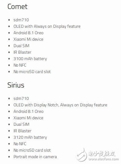 最后回歸到小米的兩款驍龍710新機上,目前整理的參數(shù)有,“Comet”擁有OLED屏,安卓8.1系統(tǒng),3100mAh電池;“Sirius”則是帶劉海的OLED屏,安卓8.1系統(tǒng),3120mAh電池,拍照加入了人像模式。