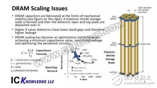 影響DRAM工藝縮減的主要問題是電容。為了可靠地存儲數(shù)據(jù),電容需要大于一定的閾值。要繼續(xù)制造出占用面積更小的電容,可以把電容做得更高,薄膜更薄,或者增加薄膜的K值。但是問題在于,雖然從機械穩(wěn)定性的角度還可以可靠地做出更高更薄的電容,但是隨著薄膜厚度的降低,漏電會增加,而且隨著薄膜K值的增加,帶隙減小也會導致漏電問題。當前的標準是使用低漏電的鋁基氧化物薄膜和用于高k值的鋯基薄膜組成的復合膜,而且目前還不清楚是否還會有更好的替代方案。