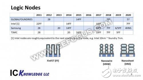 幻燈片表格下方,左側(cè)顯示的是FinFET的橫截面,這是當前先進邏輯器件首選的工藝,右側(cè)顯示了納米線和納米片,預計將在4nm左右時替代FinFET。