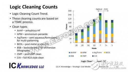 12號幻燈片是邏輯器件章節(jié)最后一張幻燈片,介紹了基于臺積電工藝節(jié)點的清洗步驟數(shù)量。當工藝尺寸下降到第一代7nm工藝時,由于增加了掩膜層,再加上多重圖案化的復雜性,清洗次數(shù)一直在增加,在隨后的7nm+和5nm節(jié)點上,由于EUV將顯著降低光刻的復雜度,因此消除了許多清洗步驟。