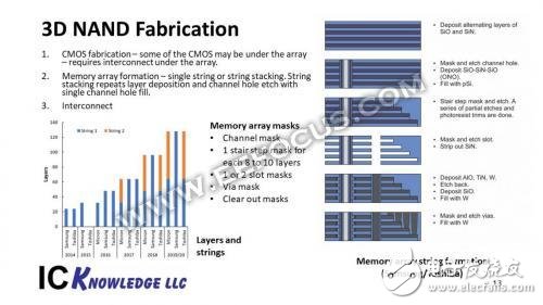 在第13張幻燈片中,我展示了3D NAND的三個主要制造步驟-CMOS制造、存儲陣列制造和互聯(lián)。三星和東芝(NAND產(chǎn)品的頭兩號供應商)使用的基本存儲陣列工藝如右側(cè)圖所示。隨著層數(shù)的增加,存儲器陣列必須在“位串堆疊”階段拆分成多個段。左下圖顯示了三家領先供應商的層數(shù)和位串。