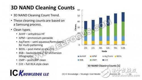 NAND工藝尺寸的縮減已經(jīng)完成落腳到了3D NAND層數(shù)的增加上。由于階梯成型需要CMP清洗,3D NAND器件的清洗次數(shù)也在不斷增加。