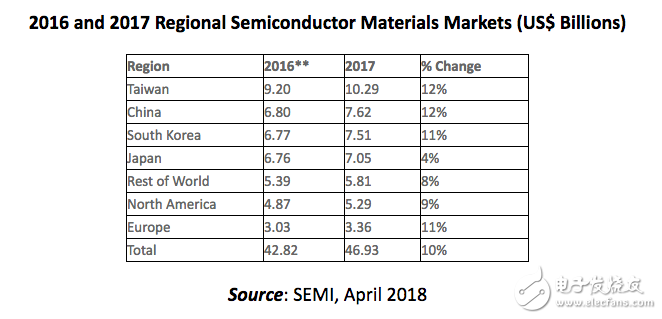 SEMI(國際半導(dǎo)體產(chǎn)業(yè)協(xié)會)宣布,2017全球半導(dǎo)體材料市場增長9.6%,全球半導(dǎo)體銷售額增長了21.6%,SEMI報告指出,2017年總的晶圓制造材料和封裝材料總額分別為278億美元和191億美元。2016年,晶圓制造材料和封裝材料市場的收入分別為247億美元和182億美元,同比增長12.7%和5.4%年。
