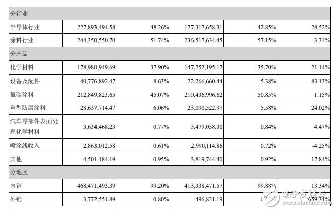 上海新陽(yáng)的主要業(yè)務(wù)為半導(dǎo)體專用化學(xué)材料及配套設(shè)備的研發(fā)設(shè)計(jì)、生產(chǎn)制造、銷售服務(wù),按產(chǎn)品類別分,2017年上海新陽(yáng)化學(xué)品實(shí)現(xiàn)銷售收入1.79億元,同比增長(zhǎng)21.14%;設(shè)備及備件實(shí)現(xiàn)銷售收入4077.69萬(wàn)元,同比增長(zhǎng)83.13%;功能性涂料實(shí)現(xiàn)銷售收入2.44億元,較上年同期增長(zhǎng)3.31%。