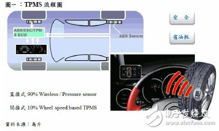 胎壓傳感器(Tire Pressure Sensor)是裝置于汽車輪胎內(nèi),可即時(shí)檢測(cè)輪胎的氣壓及溫度,并以RF方式將特定的通訊信息傳輸至車內(nèi)的接收器,駕駛者可以得知車胎目前狀況,以降低車禍發(fā)生機(jī)率,除了安全性外,由于TPMS平均可以提高2%左右燃油經(jīng)濟(jì)效率,降低二氧化碳排放,省油耗及環(huán)保,是各國(guó)立法推行TPMS列為標(biāo)準(zhǔn)配備的重要原因之一。