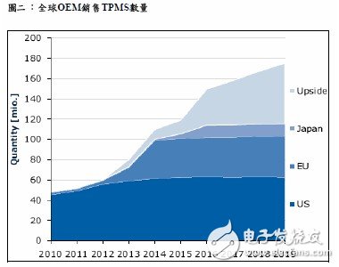 除了美國(guó)市場(chǎng)外,歐盟2012年11月開始立法推動(dòng)TPMS,2014年11月規(guī)定胎壓傳感器將列為標(biāo)準(zhǔn)配備,以歐盟每年銷售1,000萬(wàn)臺(tái)新車估計(jì),OEM市場(chǎng)需求量約為4,000萬(wàn)顆。在亞洲地區(qū),TPMS立法時(shí)機(jī)已經(jīng)成熟,日本、韓國(guó)、中國(guó)及印度等,已采取類似立法的程序,保守估計(jì)韓國(guó)2015年、日本在2017年、中國(guó)在2018年、印度在2019年,將胎壓傳感器列為標(biāo)準(zhǔn)配備,暨時(shí),亞洲OE市場(chǎng)每年胎壓傳感器,每年需求約1.6~2.2億臺(tái), 成為全球最大TPMS新車市場(chǎng)。