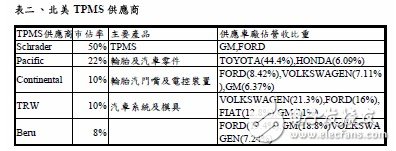 美國(guó)TPMS市場(chǎng)需求,每年隨著新車銷售變化,因OE市場(chǎng)TPMS供應(yīng)商少,營(yíng)收表現(xiàn)與新車銷售連動(dòng)性高,美國(guó)OE市場(chǎng)TPMS市占率分析,SCHRADER 50%、PACIFIC 22%、CONTI 10%、TRW10%、BERU 8%,其中產(chǎn)業(yè)龍頭SCHRADER,是全球最早開發(fā)TPMS技術(shù)的公司,在2011年全球OE市場(chǎng)市占率超過50%,也就是說年銷售超過1.6億臺(tái)TPMS Sensors,主要供應(yīng)給通用及福特及其他頂級(jí)轎車,市占第二名PACIFIC則供應(yīng)給豐田及本田車系。