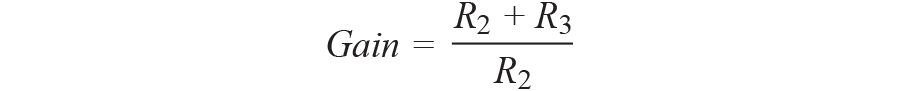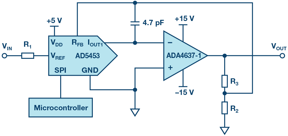除了增益和 DAC 的設定數(shù)字碼 D 之外,輸出電壓還受運算放大器電源電壓的影響或限制。在所示情況下,ADA4637-1放大器的電源電壓為±15 V 電壓,應輸出 ±12V 的最大電壓,因此其控制范圍足夠大。增益由電阻 R2 和 R3 確定: