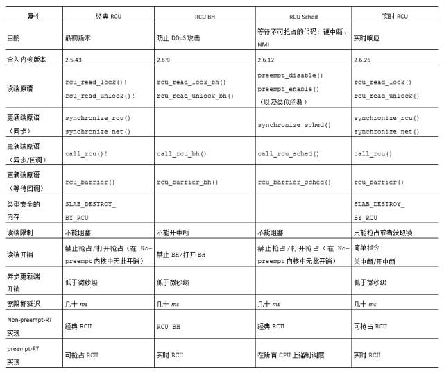 RCU的優(yōu)點(diǎn)在于:性能、不會死鎖,以及良好的實(shí)時延遲。當(dāng)然RCU也有一點(diǎn)缺點(diǎn),比如:讀者與更新者并發(fā)執(zhí)行,低優(yōu)先級RCU讀者也可以阻塞正等待優(yōu)雅周期(Grace Period)結(jié)束的高優(yōu)先級線程,優(yōu)雅周期的延遲可能達(dá)到好幾毫秒。