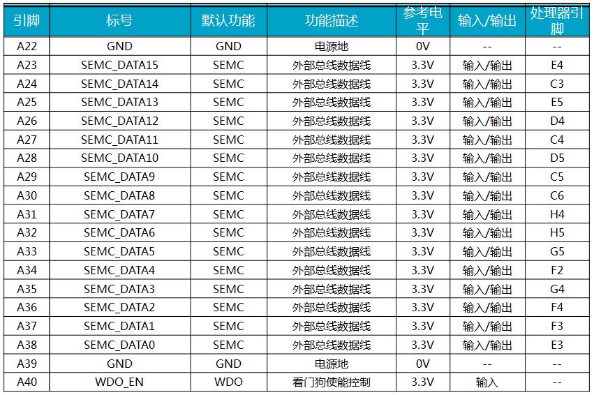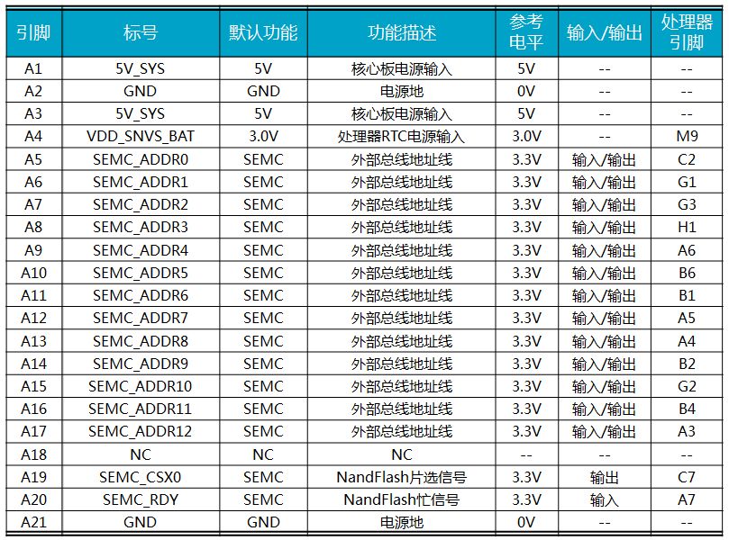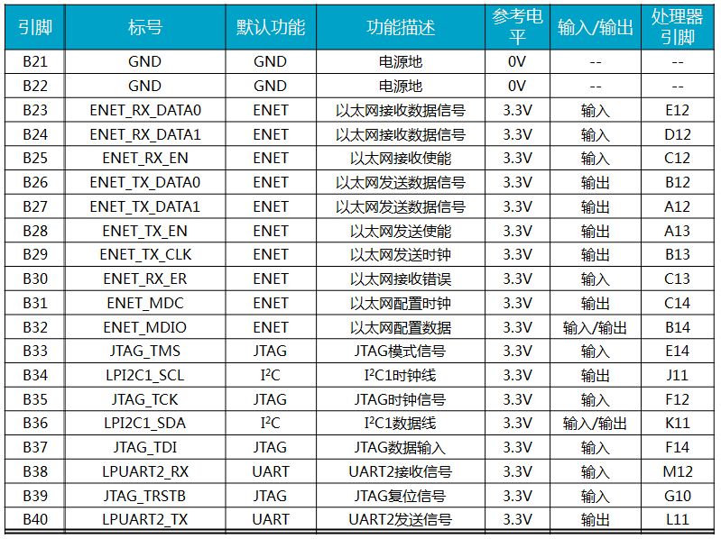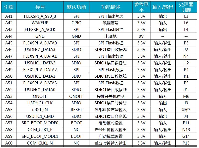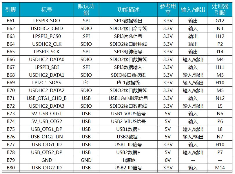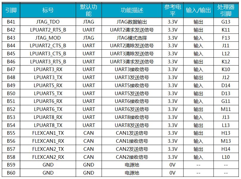 核心板采用了J1(A1 ~ A60)和J2(B2 ~ B80)兩個精密的板對板連接器將處理器的資源從背面引出。J1和J2兩個連接器對應引腳的出廠默認功能分別詳見詳見表2.2和表2.3。