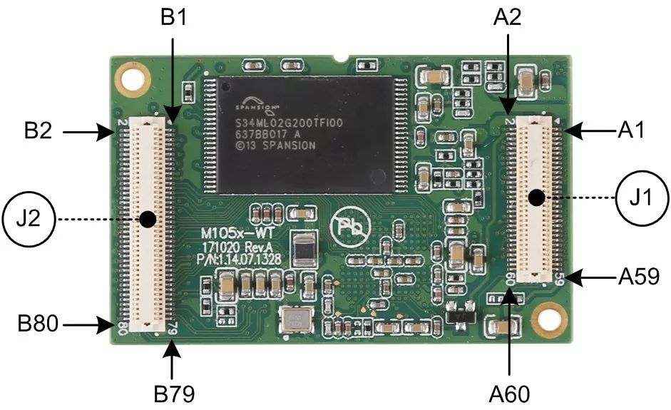 M105x系列無線核心板為了配合標準驅(qū)動軟件開發(fā),產(chǎn)品的出廠固件為I/O設置了默認功能,如果需要更換管腳功能屬性,用戶可以參考手冊,認真了解驅(qū)動架構(gòu),并在提供的SDK開發(fā)包基礎(chǔ)上自行修改驅(qū)動,適配需要的功能。配置完成后,檢查每個管腳配置是否正確,避免驅(qū)動沖突。如圖2.3所示為核心板產(chǎn)品管腳排列示意圖。