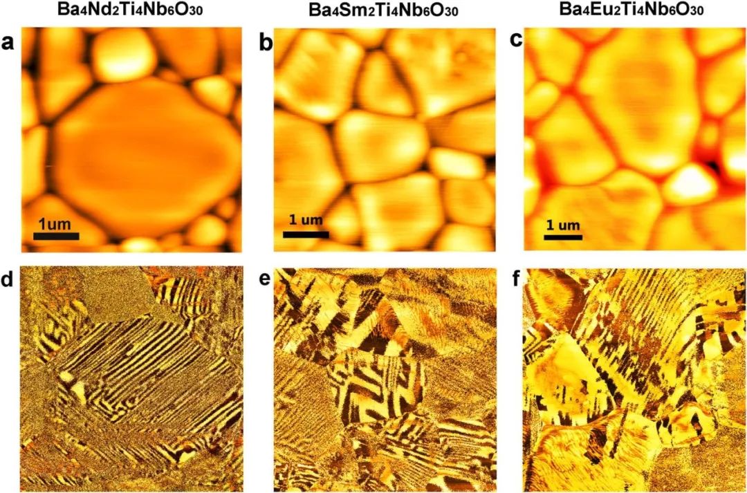 圖4. a-c: Ba4R2Ti4Nb6O30(R =Nd, Sm, Eu)陶瓷的表面形貌。d-f:壓電力顯微鏡下的電疇結(jié)構(gòu)。