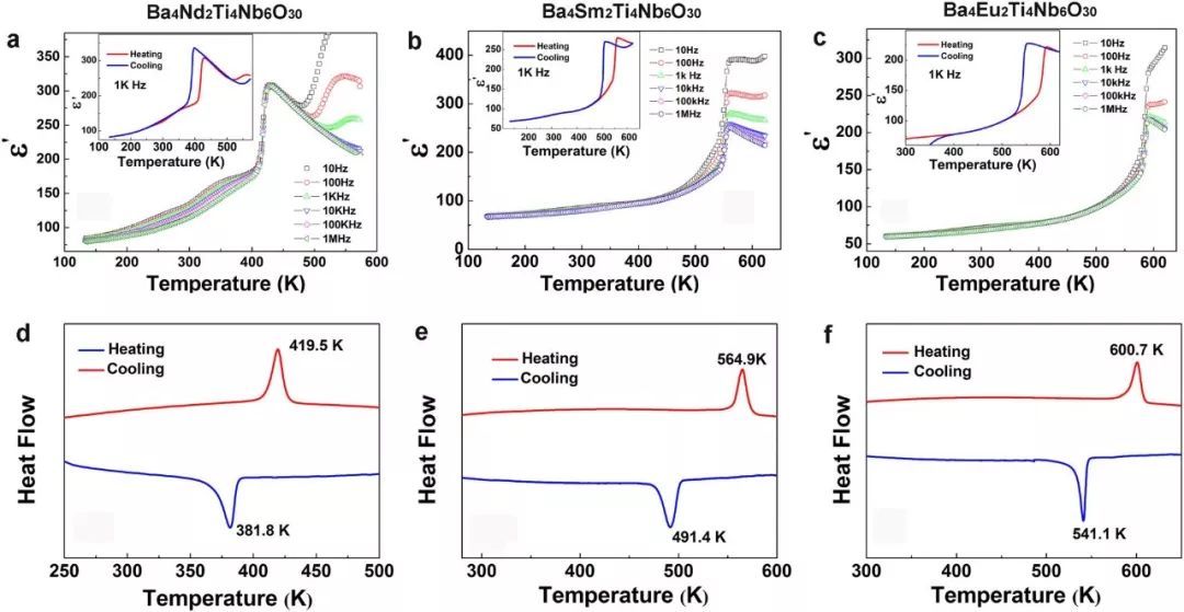 圖2. Ba4R2Ti4Nb6O30(R = Nd,Sm, Eu)陶瓷的一級(jí)鐵電相變。a-c:介電常數(shù)隨溫度的變化。插圖為1 kHz下升溫降溫循環(huán)測(cè)得的ε′-T曲線。d-f:升降溫循環(huán)測(cè)得的DSC曲線。