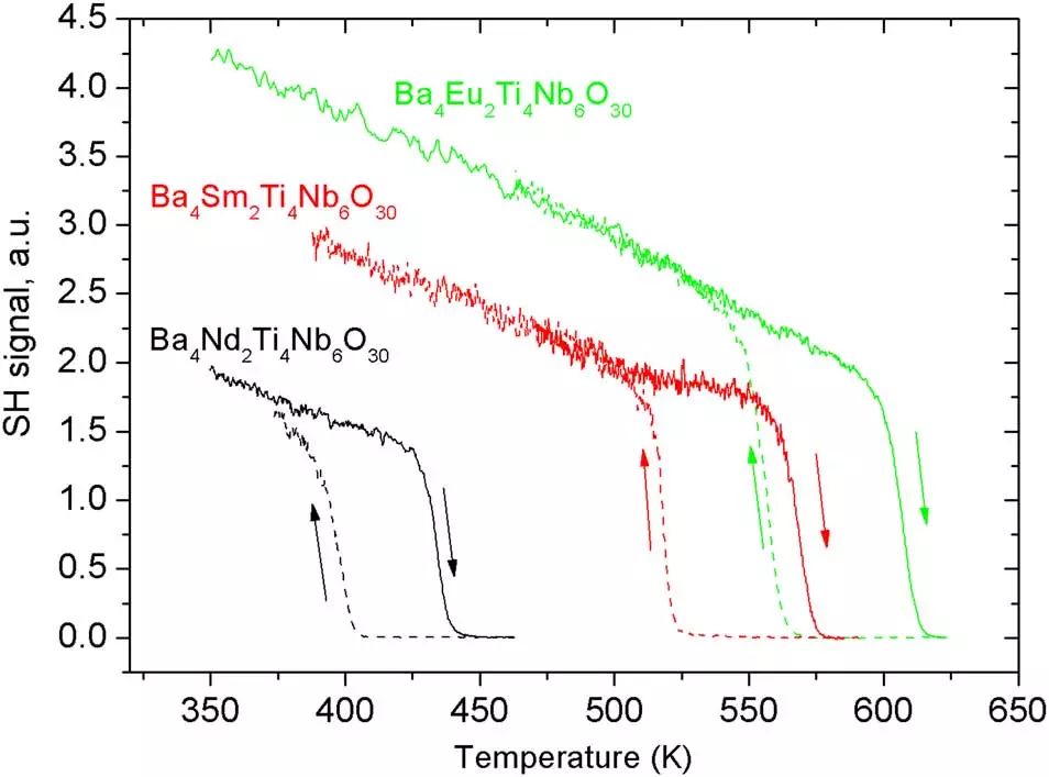 圖5. Ba4R2Ti4Nb6O30(R = Nd,Sm, Eu)陶瓷升降溫過程中的二次諧波(SHG)效應(yīng)。