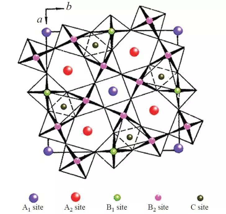 鎢青銅氧化物是鐵電材料中僅次于鈣鈦礦的第二大家族。如圖1所示,鎢青銅晶體每個(gè)晶胞由十個(gè)氧八面體共頂點(diǎn)連接形成網(wǎng)絡(luò)結(jié)構(gòu),包含四個(gè)15配位的五邊形空隙(A2)、兩個(gè)12配位的四邊形空隙(A1)和四個(gè)三角形空隙(C),其化學(xué)通式可寫為[(A1)2(A2)4C4][(B1)2(B2)8]O30。根據(jù)空隙位置的填充情況,可將鎢青銅氧化物分類為完全充滿型(A, B, C位全充滿)、充滿型(A, B位全充滿,C位空缺)與非充滿型(A位部分充滿,B位全充滿,C位空缺)三大類。關(guān)于全充滿型與非充滿型鎢青銅的研究最為充分,其介電特性也基本清楚。前者一般為正常鐵電體,作為非線性光學(xué)材料有著重要的應(yīng)用;后者一般為彌散或弛豫鐵電體,作為非線性光學(xué)材料與壓電材料而受到重視。近年來,對(duì)充滿型鎢青銅鈦鈮酸鹽M6-pRpTi2+pNb8-pO30(M=Ba或Sr; R=稀土元素;p=1, 2)的研究表明,隨著A位離子半徑差的減小,其介電特性由正常鐵電體經(jīng)彌散鐵電體最終轉(zhuǎn)變?yōu)槌谠ヨF電體[3]。