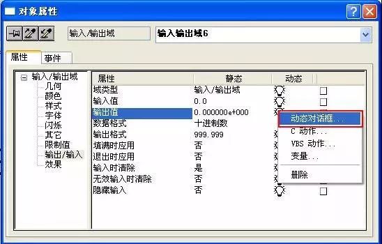 2. 輸入/輸出域的屬性設(shè)置在畫面中新建一個輸入/輸出域,打開屬性對話框。選擇屬性?輸出/輸入?輸出值,在動態(tài)部分點擊鼠標右鍵,如下圖所示: