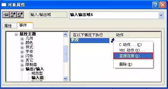 3.1更改動作設(shè)置選擇同一個輸入/輸出域,打開屬性對話框。選擇事件?屬性主題?輸出/輸入?輸入值,在更改動作部分點擊鼠標右鍵,如下圖所示: