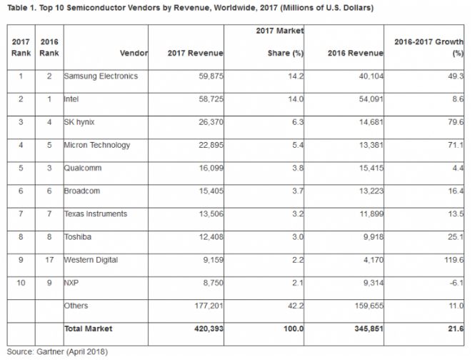 Gartner研究總監(jiān)George Brocklehurst表示:“2017年半導(dǎo)體行業(yè)有兩個(gè)里程碑,即收入超過4000億美元,以及過去25年來排名第一的英特爾三星電子打敗。這兩個(gè)里程碑都是由于內(nèi)存市場的快速增長導(dǎo)致的,供應(yīng)不足導(dǎo)致DRAM和NAND閃存價(jià)格走高。”