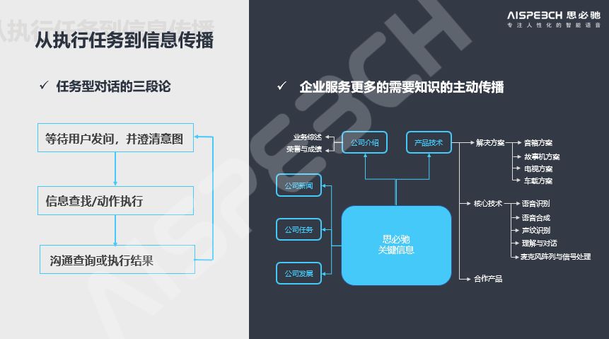 初敏帶領(lǐng)的思必馳北京研發(fā)院目前正在做這方面的嘗試,考慮將企業(yè)的基本信息、產(chǎn)品合作和市場(chǎng)等各種信息梳理到一個(gè)對(duì)話里面,開發(fā)一個(gè)啟發(fā)式對(duì)話系統(tǒng)。這個(gè)啟發(fā)式交互系統(tǒng)除了交互中任務(wù)型的信息之外,還需要做知識(shí)型、信息型的傳播工作,這個(gè)過(guò)程中機(jī)器人是一個(gè)主動(dòng)的過(guò)程,而不是一個(gè)被動(dòng)的過(guò)程。