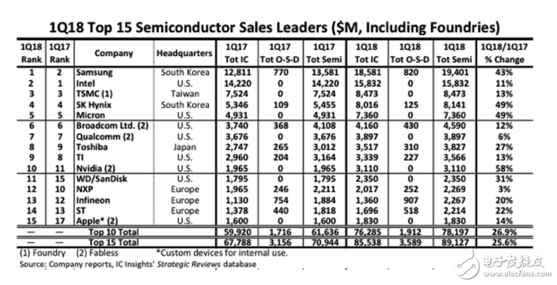 2018年第一季度全球半導(dǎo)體供應(yīng)商前十五排名狀況