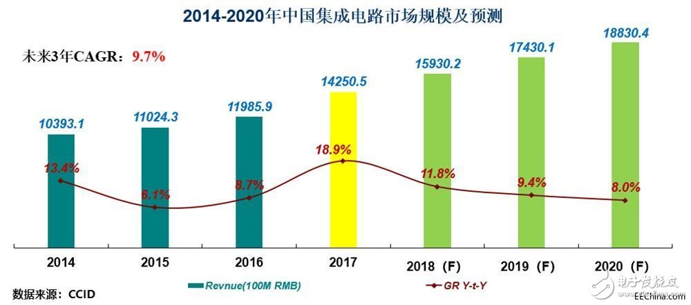 由于同樣的原因,2017年中國半導(dǎo)體市場也同比大增17.5%,規(guī)模達(dá)到16708.6億元,其中集成電路市場規(guī)模達(dá)到14250.5億元,同比增長18.9%。