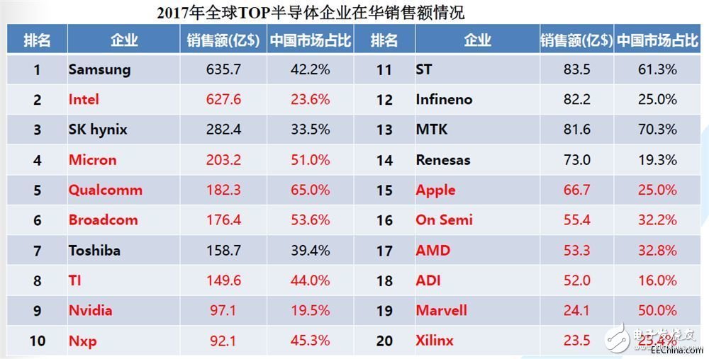 根據(jù)各家公司的財(cái)報(bào),2017全球20家頂級(jí)的半導(dǎo)體企業(yè),2017年在中國的業(yè)務(wù)額占到了其總業(yè)務(wù)額的近40%,中國市場已經(jīng)成為最不可忽視的單一區(qū)域市場。