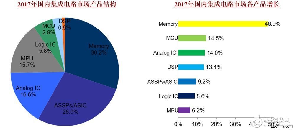 這一情況是由多方面因素造成的,一方面是以智能手機(jī)為代表的智能終端產(chǎn)業(yè)在消費(fèi)升級(jí)的趨勢下對(duì)存儲(chǔ)器的需求大增,還有就是以數(shù)據(jù)中心為代表的大規(guī)模存儲(chǔ)系統(tǒng)應(yīng)用持續(xù)升溫,也帶動(dòng)了存儲(chǔ)器市場的持續(xù)火爆。另一方面,三星、海力士、美光等存儲(chǔ)器大廠,紛紛推遲或是暫時(shí)取消了自身的擴(kuò)產(chǎn)計(jì)劃,導(dǎo)致2017年新增的產(chǎn)能跟不上市場需求的增長。存儲(chǔ)器同樣是中國集成電路市場增長最為迅猛的產(chǎn)品,全年增速高達(dá)46.9%,存儲(chǔ)器的市場占比首次超過了30%。