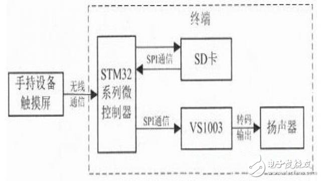 系統(tǒng)主要器件包括TFT觸摸屏、STM32F103RCT6微控制器、SD卡、語音解碼芯片VS1003、揚(yáng)聲器。STM32F103RCT6微控制器為系統(tǒng)終端的控制核心,通過它與手持式設(shè)備之間進(jìn)行無線串口通訊,讀取SD卡中的音頻文件,控制VS1003解碼讀取的數(shù)據(jù),實(shí)現(xiàn)聲音的播放與控制,該系統(tǒng)主體結(jié)構(gòu)如圖1所示。