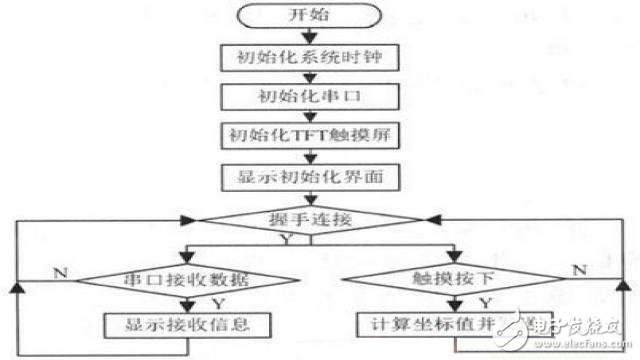 手持設(shè)備上的TFT初始化以后,就可顯示初始化界面,接著等待終端設(shè)備發(fā)送數(shù)據(jù)顯示,手持設(shè)備在完成各種初始化工作后與終端設(shè)備進(jìn)行握手連接,握手成功之后便能顯示終端設(shè)備上發(fā)送過來的信息,握手失敗后就不停嘗試著與終端設(shè)備進(jìn)行握手,直到握手成功。觸摸屏點(diǎn)擊后進(jìn)行軟件判斷得到點(diǎn)擊的坐標(biāo)值,并將坐標(biāo)值傳送至終端設(shè)備。