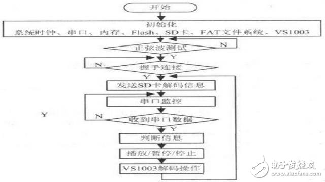 因此終端流程最開始對所需要的外設(shè)進(jìn)行初始化,確認(rèn)初始化無誤以后進(jìn)入正弦波測試,如有初始化不成功的程序?qū)⒉荒苓M(jìn)入下一個流程。在正弦波測試完之后確定終端設(shè)備上的外設(shè)運(yùn)行良好,將SD卡中的音頻文件信息解碼出來,并發(fā)送出去,此時進(jìn)入串口監(jiān)控狀態(tài),時刻監(jiān)控串口信息,當(dāng)收到播放指令時即在SD卡中尋找對應(yīng)的信息,并從SD卡中將數(shù)據(jù)讀取出來,發(fā)送至VS1003進(jìn)行解碼,在播放過程中如接收到新的串口數(shù)據(jù),再進(jìn)行判斷,是停止還是暫?;蛘咂渌?,然后執(zhí)行相應(yīng)的命令。