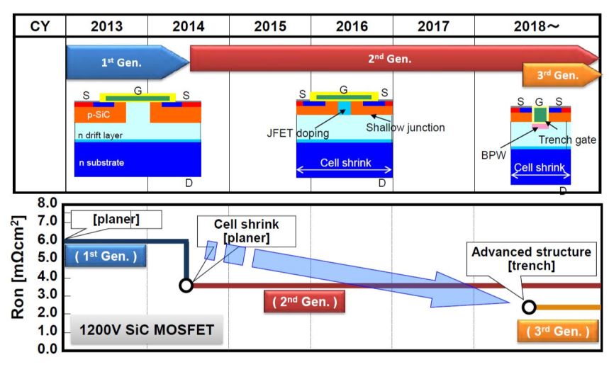 如圖1所示,三菱電機(jī)的SiC功率模塊目前正處于開始于2010年前后的SiC商業(yè)化第1個(gè)階段。然而,早在20多年前,三菱電機(jī)就開始了針對SiC技術(shù)的開發(fā) [1]。在1994年至2004年的第1個(gè)10年中,其研發(fā)工作主要針對SiC MOSFET和SiC肖特基二極管等芯片技術(shù)本身。此后,在2005年至2009年間,三菱電機(jī)將開發(fā)重點(diǎn)集中到了應(yīng)用SiC功率模塊于逆變器中,以實(shí)現(xiàn)可觀的系統(tǒng)效益。為此,三菱電機(jī)設(shè)計(jì)并評測了多種應(yīng)用場合的基于SiC功率器件的逆變器。SiC功率模塊的商業(yè)化階段開始于2010年至2014年間。在此期間,三菱電機(jī)推出了多種類型的全SiC功率模塊和混合SiC功率模塊。同時(shí)基于三菱電機(jī)SiC功率模塊的逆變器開始第1批工業(yè)化生產(chǎn),并主要用于日本市場。此外,SiC MOSFET芯片技術(shù)也得到了進(jìn)一步改善,1200V SiC MOSFET芯片的開發(fā)路線如圖2所示。