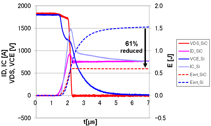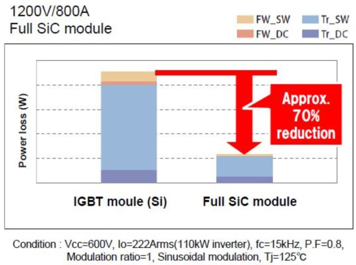 b)若保持逆變器的功耗同一水平,即逆變器效率和散熱器尺寸保持不變,由于SiC MOSFET模塊開關(guān)頻率相對Si-IGBT模塊可以提高3~5倍,因此,在配有大電感器等元件的應(yīng)用中,這就為減小電感器尺寸(成本)提供了新的空間。