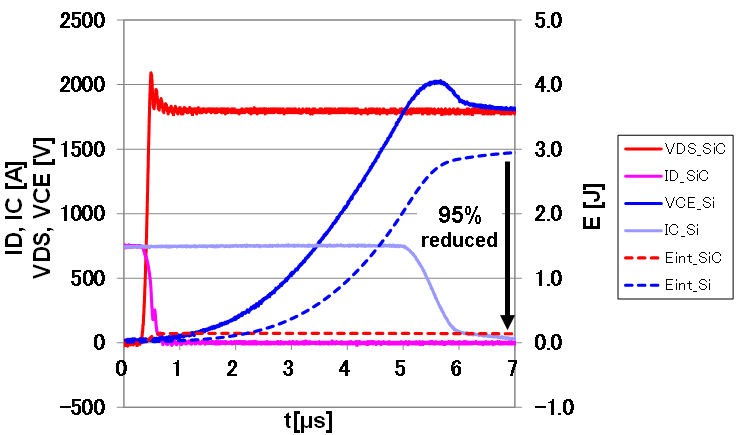 圖12 800A/1200V Si-IGBT模塊與全SiC MOSFET模塊的功耗對比