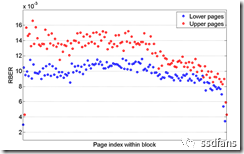 RBER還跟閃存內(nèi)部結(jié)構(gòu)也有關(guān)系。兩個(gè)相鄰閃存塊的RBER有可能完全不同,圖1-26是單個(gè)閃存塊里面不同閃存頁的RBER分布圖??吹贸鰜?,Upper Page的RBER比Lower Page要高兩個(gè)數(shù)量級(jí)。
