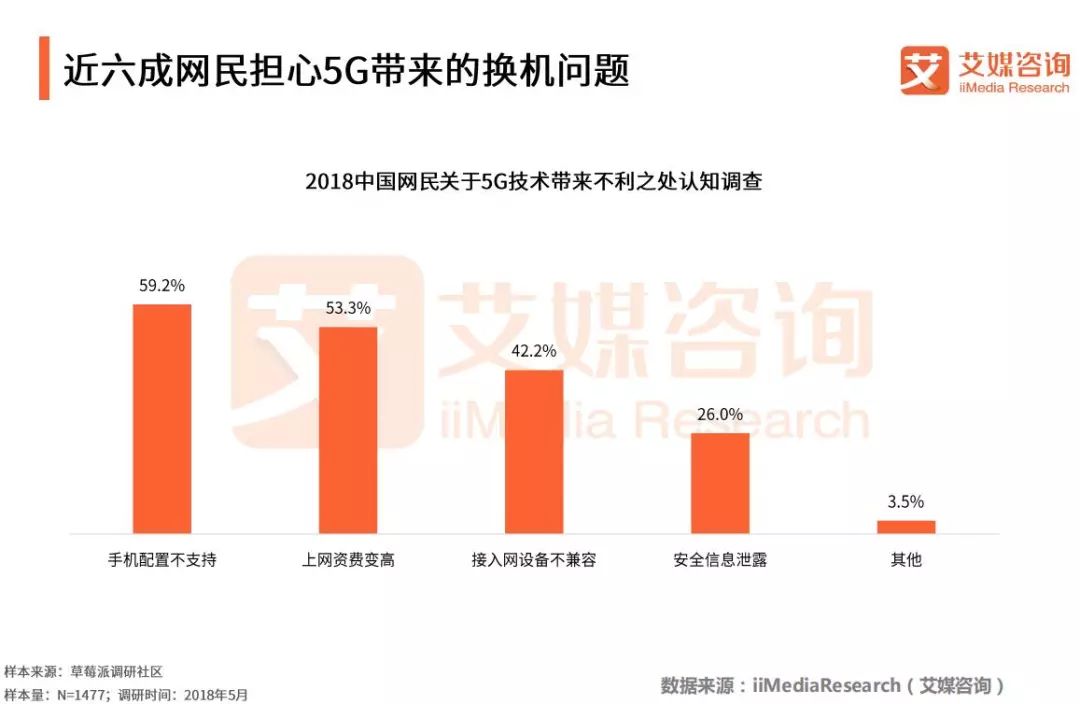 iiMediaResearch(艾媒咨詢)數(shù)據(jù)顯示,59.2%的受訪網(wǎng)民認(rèn)為自身原有手機(jī)配置將會不支持使用5G,因此可能會被迫換機(jī)。另有53.3%的受訪網(wǎng)民認(rèn)為上網(wǎng)資費(fèi)過高將是5G帶來的不利影響。
