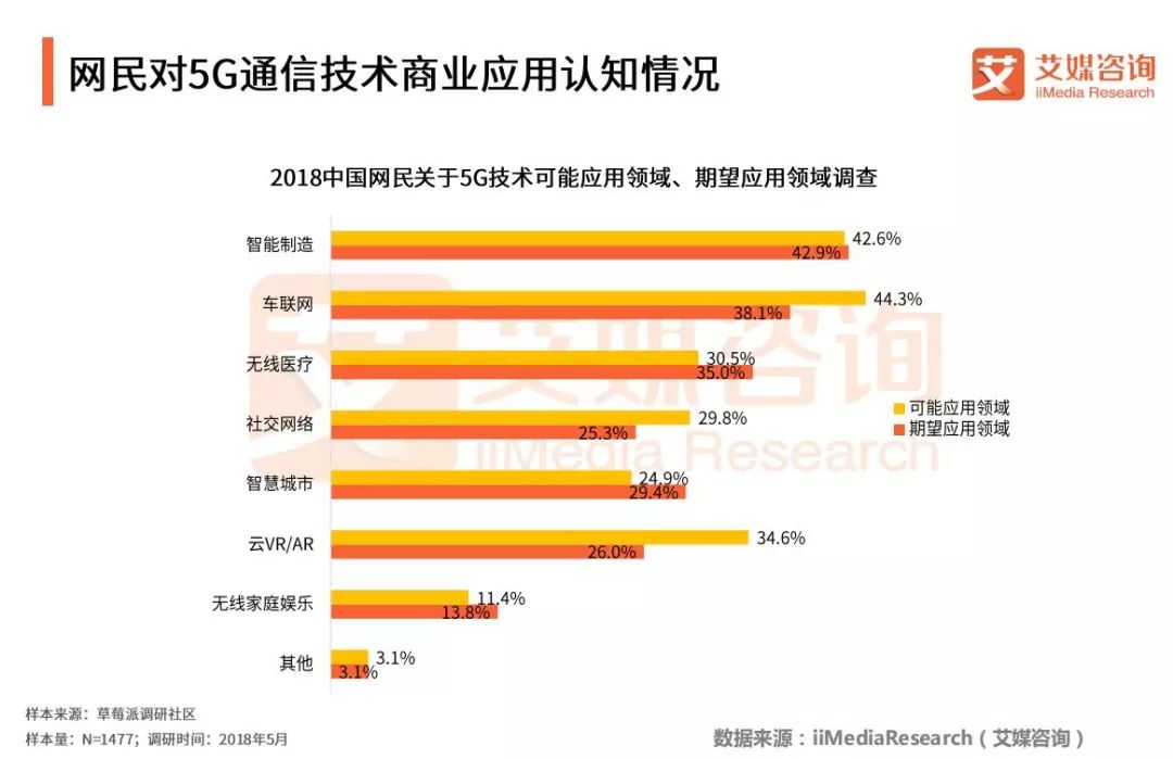 iiMediaResearch(艾媒咨詢)數(shù)據(jù)顯示,受訪網(wǎng)民認(rèn)為5G技術(shù)在未來可能被廣泛應(yīng)用的領(lǐng)域前三位分別是:車聯(lián)網(wǎng)、智能制造、云VR/AR。另外,從期望5G應(yīng)用領(lǐng)域來看,排名前三位的是智能制造、車聯(lián)網(wǎng)和無線醫(yī)療。