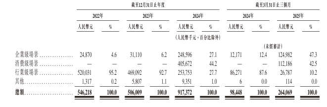 招股書顯示,2023年期間,云天勵(lì)飛的主要收入來源為行業(yè)級(jí)場(chǎng)景,占總營(yíng)收的90%以上。隨著公司在消費(fèi)級(jí)場(chǎng)景的持續(xù)布局,行業(yè)級(jí)場(chǎng)景的收入占比逐步下降。到2025年第一季度,企業(yè)級(jí)、消費(fèi)級(jí)和行業(yè)級(jí)場(chǎng)景的收入占比分別為47.3%、42.5%和10.2%。