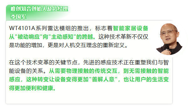 唯創(chuàng)WT4101A系列雷達(dá)模組,正是這場技術(shù)革命的先行者,用創(chuàng)新技術(shù)為智能設(shè)備注入"感知"的靈魂,開啟人機(jī)交互的新篇章。