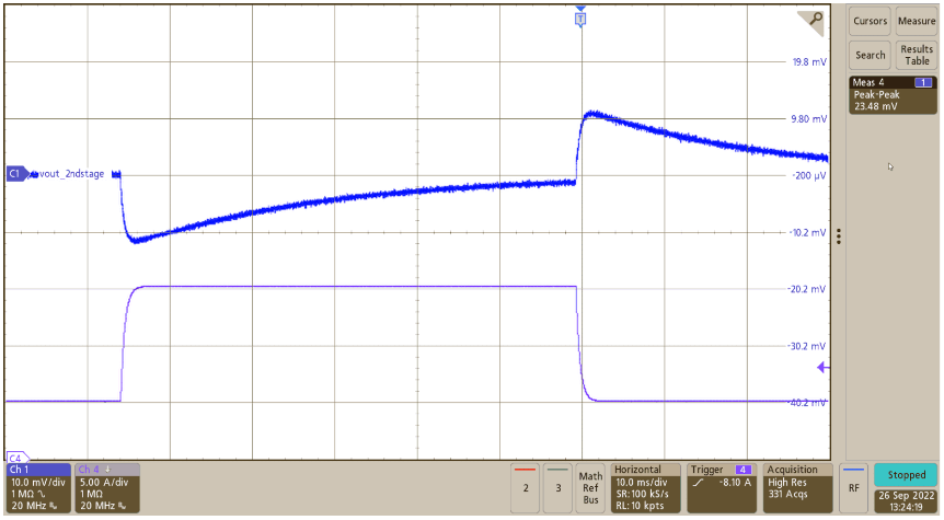 D-CAP3 使用一次性計時器生成與輸入電壓和輸出電壓成正比的導(dǎo)通時間脈沖。當(dāng)下降反饋電壓等于基準電壓時,將生成新的 PWM 導(dǎo)通脈沖。斜坡由輸出電感器仿真。來自內(nèi)部紋波注入電路的信號直接饋入比較器,消除了其失調(diào)電壓,從而減少了對電容器 ESR 輸出電壓紋波的需求。D-CAP3 和其他恒定導(dǎo)通時間轉(zhuǎn)換器的優(yōu)勢之一是無需額外的環(huán)路補償電路。但是,如果器件支持此功能,并且在輸出電壓反饋電阻分壓器網(wǎng)絡(luò)中添加了前饋電容,則控制環(huán)路的功能可通過可調(diào)斜坡進行調(diào)整。在沒有額外濾波器的情況下,TPS548A28 輸出電壓峰峰值紋波為 7.6mV。應(yīng)用額外濾波器后,輸出電壓紋波為 2.3mV(如圖 4 所示)。在此情況下,TPS548A28 設(shè)計無需進行調(diào)整即可確保穩(wěn)定性。圖 5 顯示了與之前的轉(zhuǎn)換器具有相同 10A 負載階躍的負載瞬態(tài)波形,并且實施第二級濾波器后的輸出電壓波形沒有不穩(wěn)定的跡象。