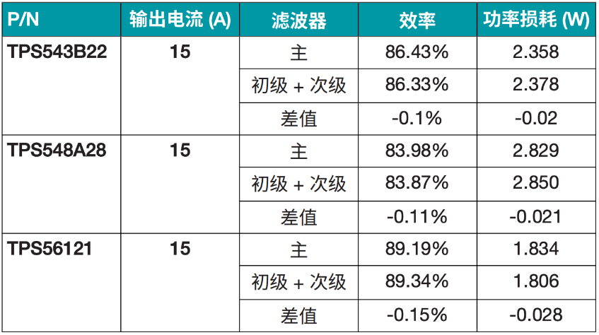 在具有和不具有額外第二級濾波器的情況下測量了每個直流/直流轉(zhuǎn)換器的滿載效率以比較功率損耗。表 2 所示為相關(guān)結(jié)果。第二級濾波器的功率損耗和效率損失可忽略不計。之所以測量效率和功率損耗差異,是因為每個直流/直流轉(zhuǎn)換器都具有獨特的功率 MOSFET,這會導(dǎo)致效率結(jié)論不準確。效率損失和額外所需的 92mm2 布板空間是否值得改善輸出電壓紋波,這由設(shè)計人員決定。
