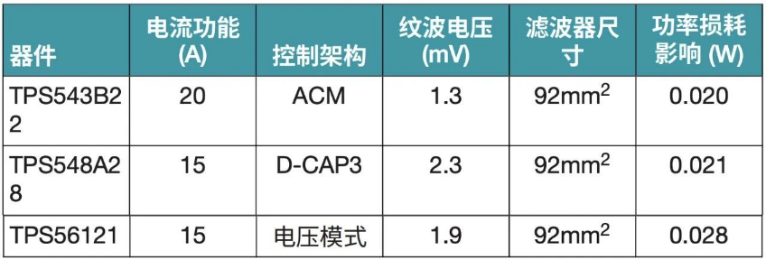 為了約束濾波器設(shè)計和性能預(yù)期,允許的紋波電壓為輸出電壓的 ±0.15% 或 ±1.5mV (3mVpp)。我們采用三個 TI 直流/直流轉(zhuǎn)換器進行比較:15A D-CAP3? 降壓轉(zhuǎn)換器(TPS548A28)、 20A 內(nèi)部補償高級電流模式 (ACM) 降壓轉(zhuǎn)換器 (TPS543B22) 和 15A 電壓模式降壓換器(TPS56121)。我們在轉(zhuǎn)換器支持類似第二級濾波器元件的能力范圍內(nèi),選擇了盡可能彼此接近的輸出電壓、輸出電流和工作頻率。