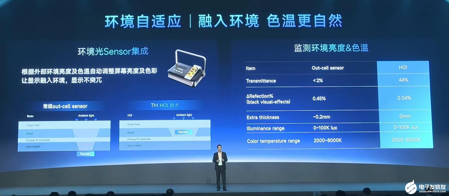 天馬自研了環(huán)境光Sensor集成,讓屏幕可以根據(jù)外部環(huán)境亮度及色溫自動調(diào)整屏幕亮度及色彩讓顯示融入環(huán)境,顯示不突兀。