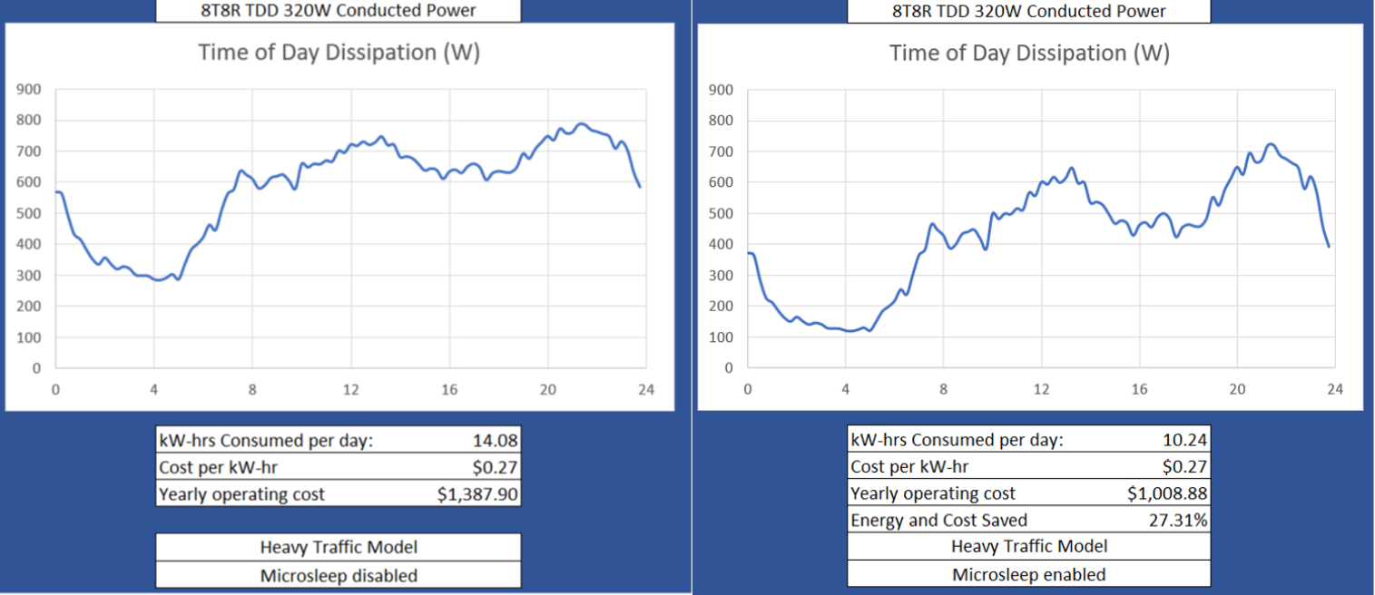 O-RU 是接入網中功耗最高的組件。不過,可以通過多種手段實現(xiàn)節(jié)能,例如可變時鐘、動態(tài)功率放大器偏置、小區(qū)和載波關閉、射頻信道重新配置、睡眠模式、間斷收發(fā)等。隨著 RAN 的分解,需要明確各組件特性,以全面了解系統(tǒng)和網絡層面的權衡。圖 5 對比展示了啟用和未啟用微睡眠模式時,O-RU 站點在 24 小時內的功耗以及潛在的節(jié)能效果。