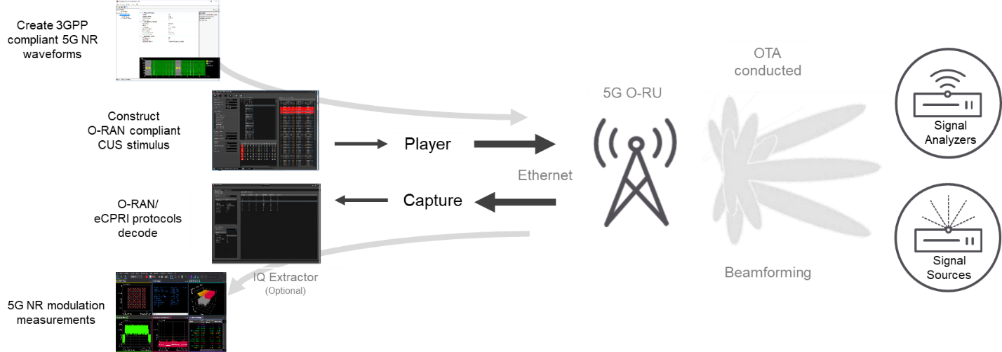 由于涉及大量參數(shù),創(chuàng)建符合 5G 標準的測試矢量是一項復雜的任務。 更為棘手的是,這些測試刺激信號需要以同步方式從 DU 上的以太網接口、非標準化時域 IQ 接口或射頻接口發(fā)送,以完成完整的無線測試。