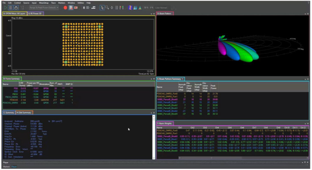 要測試大規(guī)模多輸入多輸出無線電單元,需要具備:O-DU 模擬器,配備通過以太網接口生產、播放、捕獲和測量 O-RAN 流量的工具;多射頻收發(fā)器,用于在不同方向上產生帶有噪聲和干擾的波束,并同時接收信號。測試裝置不僅需要測量上行和下行鏈路方向的所有波束和信號,還需要能夠精確定位波束賦形問題。圖 4 顯示了帶幅度和相位權重的下行鏈路波束賦形示例,以及相應的波束模式和 EVM 數(shù)據(jù)。