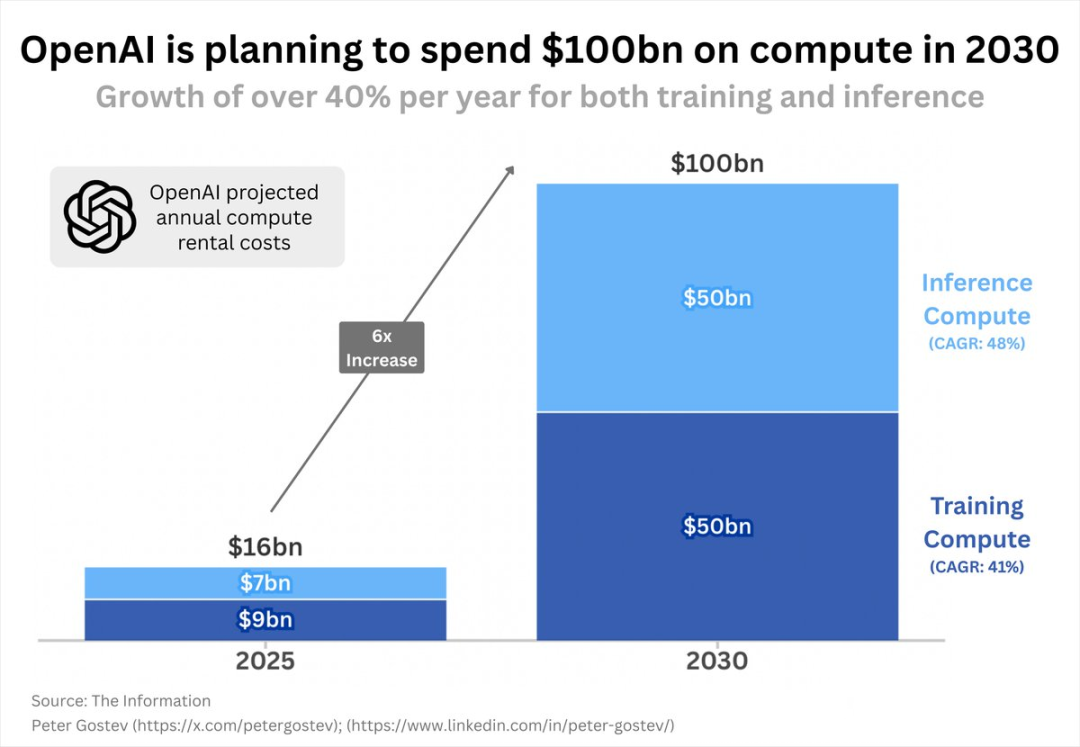 The Information的數(shù)據(jù)顯示,2025年,OpenAI在計算資源方面的總支出達(dá)到了160億美元。在這其中,訓(xùn)練計算成本占據(jù)了90億美元,而推理計算成本為70億美元。根據(jù)OpenAI的預(yù)測,到2030年,其在計算資源上的總投入將激增至1000億美元,相較于2025年的160億美元,增長了近6倍,訓(xùn)練計算和推理計算的成本都將接近500億美元。