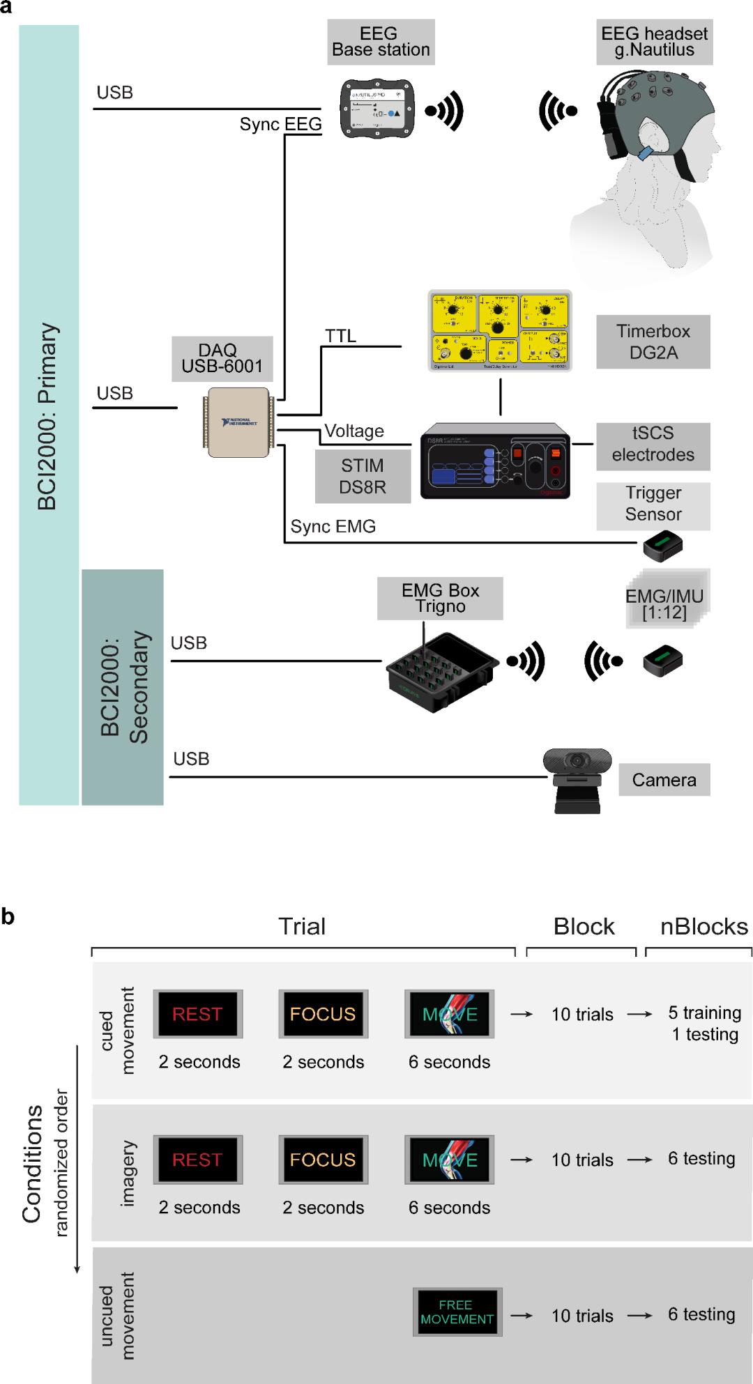 同步機(jī)制:使用NI-DAQ板生成同步脈沖,通過(guò)TTL信號(hào)同步EEG、EMG和tSCS設(shè)備(圖2a)。所有數(shù)據(jù)流在BCI2000平臺(tái)中統(tǒng)一時(shí)間戳。